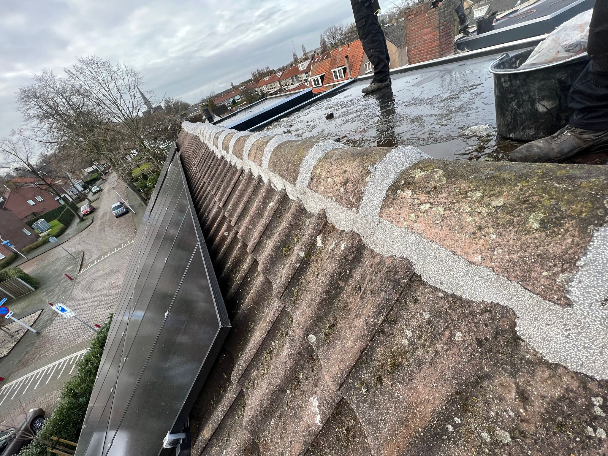 We starten met een grondige visuele inspectie van je dak. We controleren dakpannen, goten, loodwerk, naden en aansluitingen. Ook kijken we naar tekenen van slijtage, mosgroei of beginnende scheuren. Zo krijgen we snel een compleet beeld van wat er nodig is.